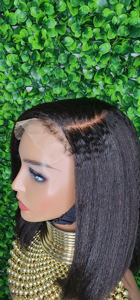Blunt Cut Italian Yaki Straight Human Hair Wig Glueless Lace Front Bob Wig 4C Kinky Edges Natural Hairline Lace Wig